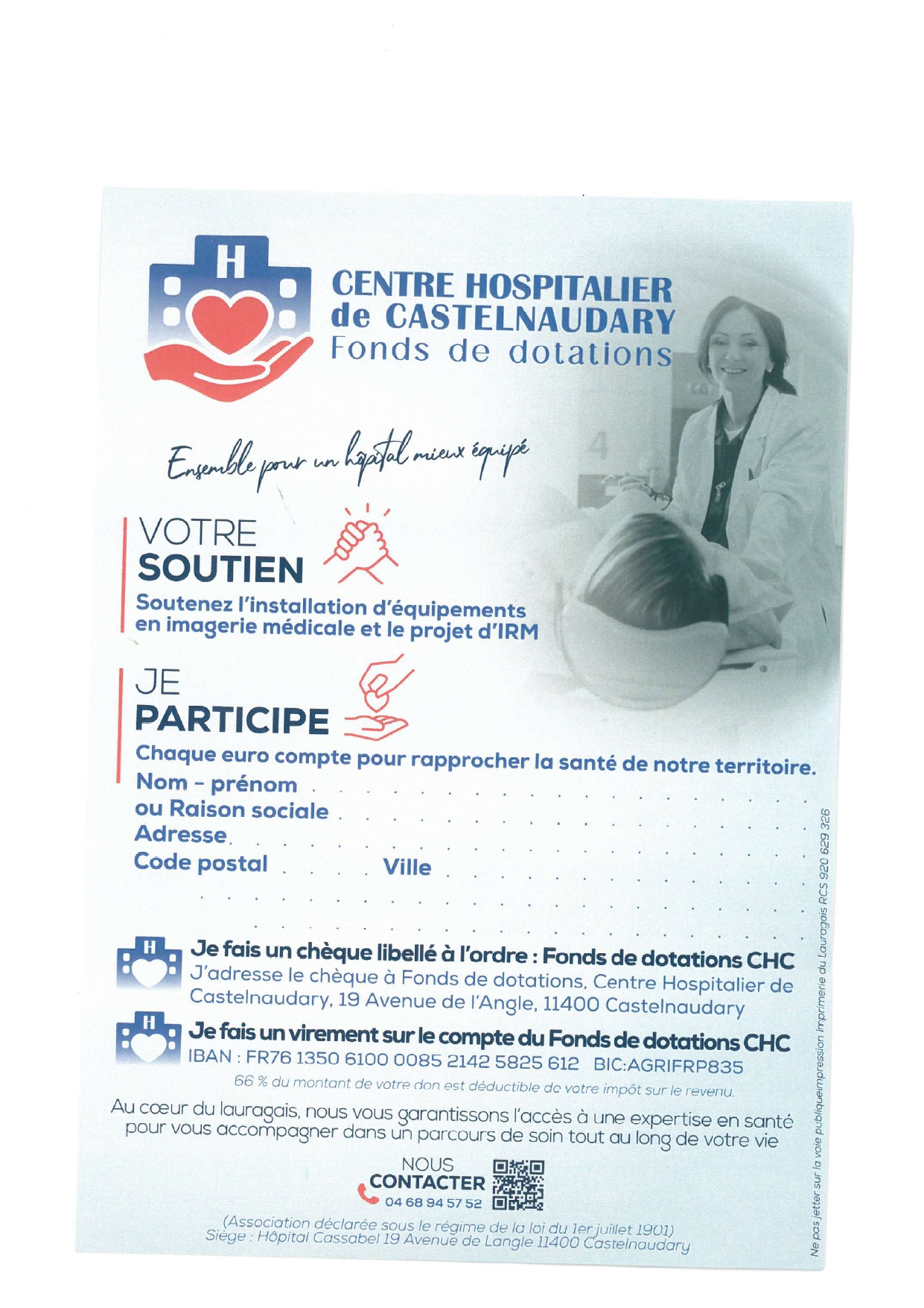 Chaque don contribuera au financement d’un équipement dont la population pourra bénéficier, notamment à des fins de prévention. Les dons ouvrent droit à une réduction d’impôt de 60 % sur les impôts directs.